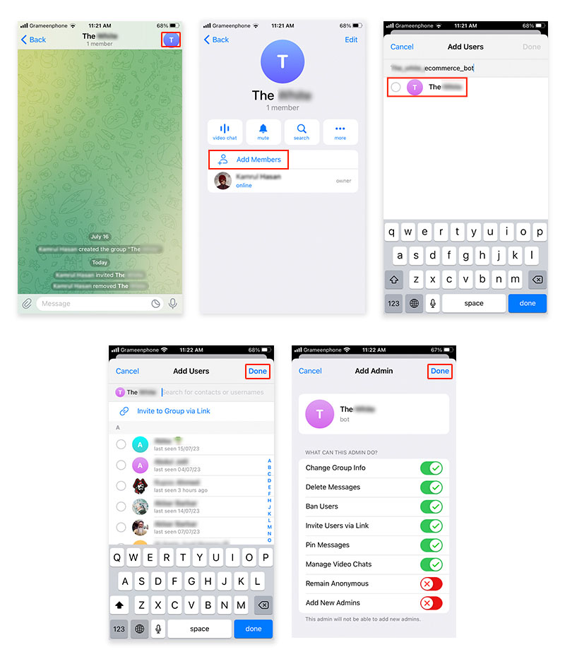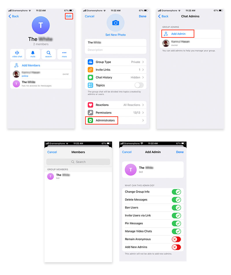 To make the bot admin of the group from the phone app, go to the group and click on the edit button first. Then go to administration and click on the “Add admin” button. This will show the members of the group. Select the bot account, review the permissions the bot will get. Finally, click on the “Done” button.