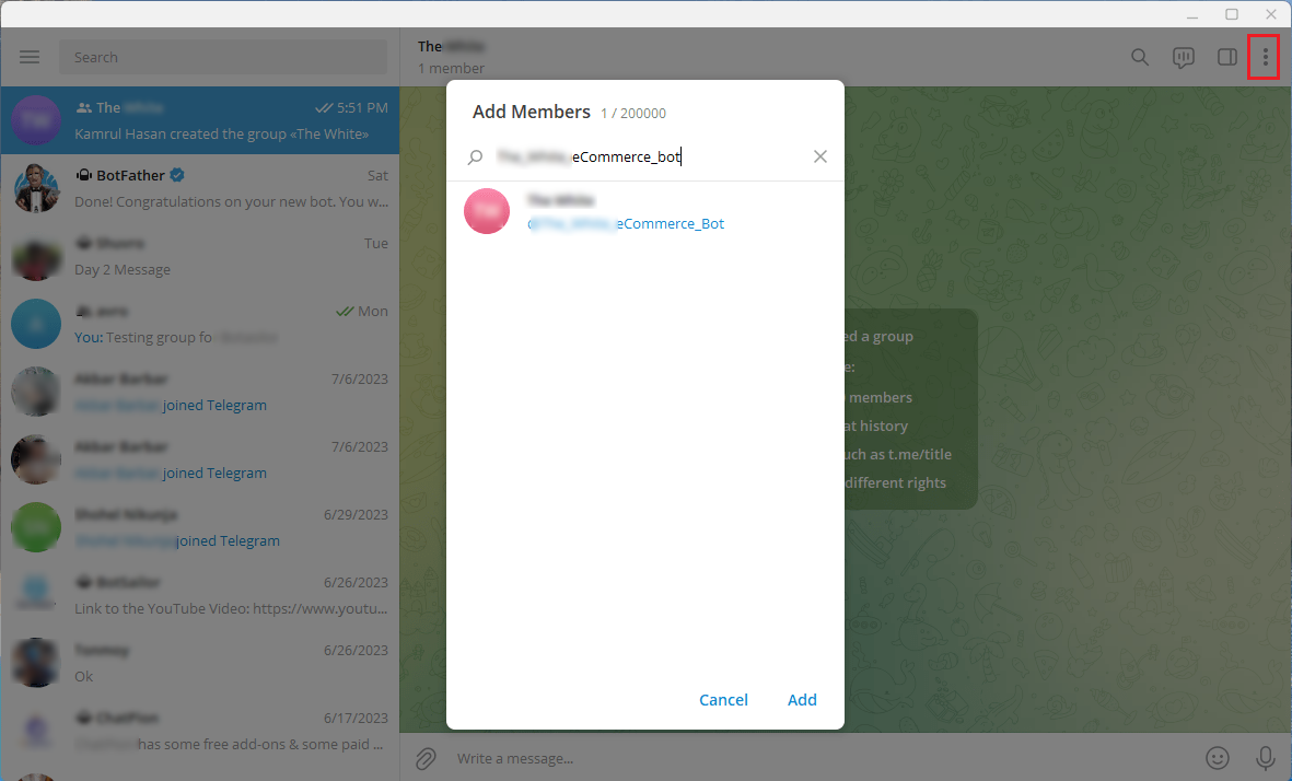 From the group, click on the top of the group to get the settings. Then click on the “Add members” button. Search for the bot account and select it. Then click on the done
