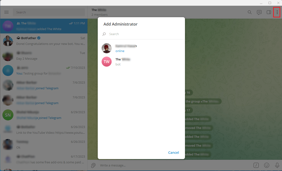 To make the bot admin of the group from the phone app, go to the group and click on the edit button first. Then go to administration and click on the “Add admin” button. This will show the members of the group. Select the bot account, review the permissions the bot will get. Finally, click on the “Done” button.