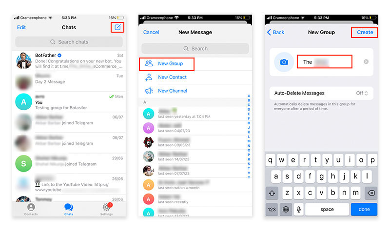 To create a group from the phone app click on the edit button from the Chats and click on New Group option. Give a name to the group and click on the create button.