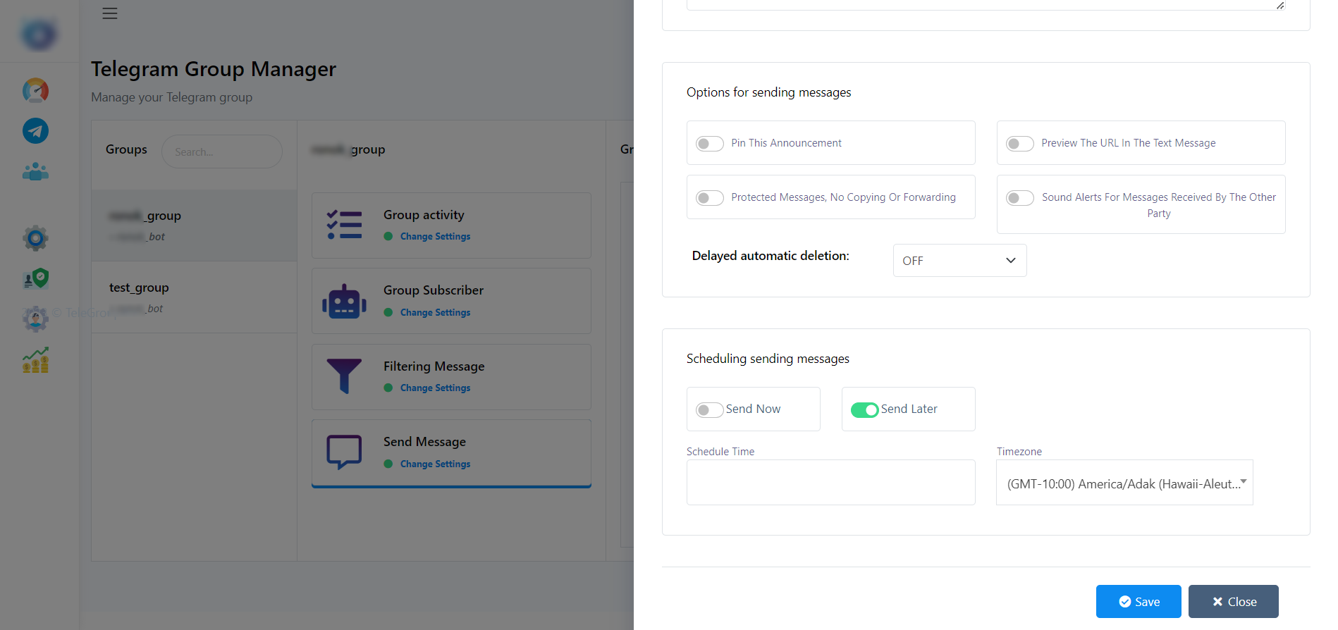 With Tele group Manager, you can send message to a group instantly or schedule it for later. Some options in message sending by Tele group Manager are as follows